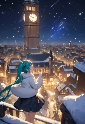 masterpiece, best quality, extremely detailed, anime, girl, skirt, Hatsune Miku, VOCALOID, blue green long twin tail, starry night, snowflakes, shooting stars, starry sky, night town, powdery snow, winter, city, fluffy coat, clock tower, twintail, long hair, blue hair, green hair, blue eyes, fairy