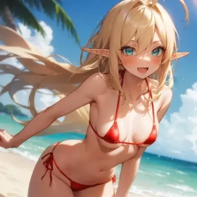 super fine illustration, an extremely cute and beautiful girl, BREAK, elf, (dark skin:1.4), highly detailed beautiful face and eyes, emeraldgreen eyes, beautiful long blonde hair, straight hair BREAK , blush, naughty smile, fang, ahoge, BREAK, large breasts, (skinny:1.2), (mature female:1.4), narrow waist, BREAK, (wearing blue micro bikini:1.4), beach, dutch angle, cowboy shot, looking at viewer