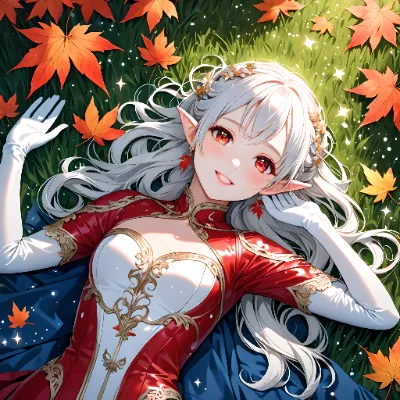 8K,((masterpiece,best quality,Ultra extremely detailed,perfect anatomy,detailed,high-resolution,highres,extremely detailed)),((UPPER-BODY,Flowers print,child elf wearing glossy jewelry decoration red thin-leather-suit-dress with sparkle reflected light, wearing white-sox, see-through sleeves,see-through white gloves, see-through white boots)),looking at viewer, red Eyes, Reflections reflect strong highlight in eyes,waving shining long white hair_with curly,elf ear with big earrings,opened_mouth:1.5,smile,blush,lipstick,full fresh lips,wet_lip,big hip,small breasts,face-up,Arms up,BREAK,4K,fireworks,plaza in grasses,many maple leaves,maple treeBright Nights,((many shooting stars)), <lora:hairdetailer:1> <lora:make25d_type1_v100:1>