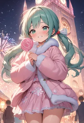 Hatsune Miku, VOCALOID, blue-green long twin tail, girl, snowy town, fireworks launch into a sky full of stars. The girl, dressed in a fluffy skirt and fluffy coat, has a cute smile and is cheerful. My child, child, snowflake, clock tower, night town, parade, cute