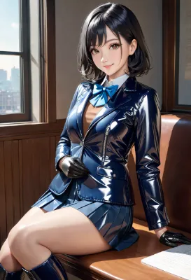 (photorealistic:1.4), (RAW photo), masterpiece, best quality, extremely detailed, lady, neat and clean, shy look, dark brown medium length hair, almond shaped eyes, staring, smile, gray pleated skirt, blue ribbon bow tie, navy blazer, shiny down jacket, glossy puffer jacket, enamel knee high boots, commuting to school, cold day, sunny, low angle