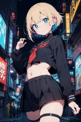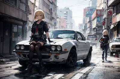 1girl posing next to car, solo, (black serafuku):1.4, (flowing hair, blonde short hair), work gloves, tool belt, <lora:zeekars:0.65>, <lora:Silicon-landscape-isolation:1>