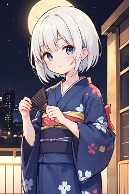 score_9, top quality, high resolution, masterpiece, ideal proportions, absurd, very delicate and beautiful, very detailed eyes, very detailed clothes, nice hands, perfect hands, super detailed illustrations, source_anime, Yukata with floral pattern white, yellowish, holding a fan in the right hand and hiding the mouth, very cute smile, front view, cow shot, long hair, bob cut, blue eyes, 風鈴, night view, moon, summer, girl, brown hair, ponytail, festival, girl 16 years old