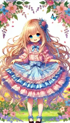 青ブラウスも可愛い。緑スカートと組み合わせなかなかです。 プロンプト: 「1人のとても小柄な女性。とても背の低く、とても長く明るい金髪、とても長くまっすぐ流れるようなストレートヘア。身長はとても低く、水色のフリルブラウスを着ている。薄緑色のロングスカートにはたっぷりとフリルが幾重にも重なり、薄緑色のロングスカートは多くのフリルとレースで豪華に飾られている。ロングスカートの裾やウエスト部分にもフリルとレースの装飾が豪華に施されて、裾まで華やかに広がっている。首元には緑色のリボンをつけている。ウエストに緑色のリボンをつけている。非常に小柄で可愛く、非常に低い背であり、顔を赤くして笑顔を浮かべていている。非常に長く明るい金髪のストレートヘアが広がっている。青い目。花畑に立っている。とても背が低い。とても小柄な姿で可愛い。全体がアニメ風に描かれ、非常に詳細な描写。アスペクト比は縦長」の絵を描いて