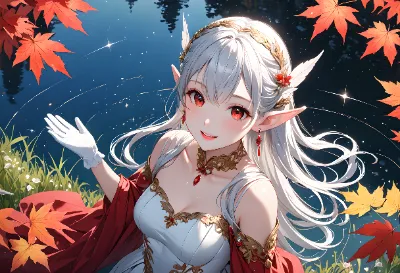 8K,((masterpiece,best quality,Ultra extremely detailed,perfect anatomy,detailed,high-resolution,highres,extremely detailed)),((close-up head,from_above,Flowers print,girl elf wearing glossy jewelry decoration red cloth-dress with sparkle reflected light, wearing white-sox, see-through sleeves,see-through white gloves, see-through white boots)),looking at viewer, red Eyes, Reflections reflect strong highlight in eyes,waving shining long white hair_with curly,elf ear with big earrings,opened_mouth:1.5,smile,blush,lipstick,full fresh lips,wet_lip,big hip,small breasts,standing,BREAK,4K,silent lake,plaza in grasses,many maple leaves,maple tree,Bright Nights,((many shooting stars)), <lora:hairdetailer:1> <lora:make25d_type1_v100:1>