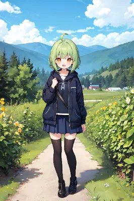 Score_9, Score_8, Score_7, Source Anime, Masterpiece, Best Quality, Very Detailed, Cute, Amazing, Detailed, Beautiful, perfect hand, perfect finger, One 16 year old girl, long wavy brown hair, light blue eyes,静寂の湖, High neck sweater beige, down coat, shearling long boots brown, long check skirt indigo, knee socks black, model posing, from front, full body, standing, happy smile, day