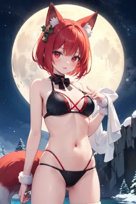 girl, braids, green hair, red eyes, quiet lake, fox girl, original character, colorful, steampunk, winter, full moon, night, starry sky, night sky, different world, beautiful fox girl, bikini Santa Claus costume, bathes, moon prayer