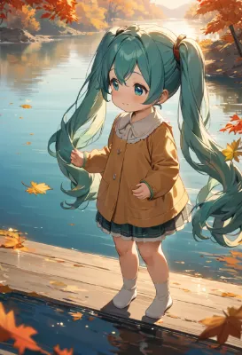 masterpiece, best quality, extremely detailed, anime, girl, skirt, Hatsune Miku, blue-green long twintails, girl, serene lake, a girl looking at the lake with a gentle smile, trees by the lake are autumn-colored, soft sunlight shimmering on the quiet lake surface, autumn clothing, my child, child, young girl