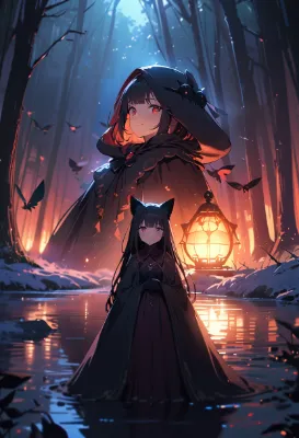 expressive eyes, perfect face, 1 Girl, witch, winter, lake side, lake of silence, buddy black cat, moths, outdoors, silence, for the audience, standing, smile, 傑作, 最高品質, extremely fine and beautiful colors, extremely beautiful and fain design, amazing sapraizz, dynamic production, high resolution, professional lighting, extremely detailed, 8k, 静寂の湖, <lora:saturation:1>, <lora:make25d_type4_v100:1>, perspective