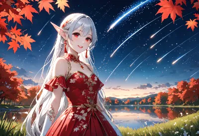 8K,((masterpiece,best quality,Ultra extremely detailed,perfect anatomy,detailed,high-resolution,highres,extremely detailed)),((close-up head,Flowers print,girl elf wearing glossy jewelry decoration red cloth-dress with sparkle reflected light, wearing white-sox, see-through sleeves,see-through white gloves, see-through white boots)),looking at viewer, red Eyes, Reflections reflect strong highlight in eyes,waving shining long white hair_with curly,elf ear with big earrings,opened_mouth:1.5,smile,blush,lipstick,full fresh lips,wet_lip,big hip,small breasts,standing,BREAK,4K,silent lake,plaza in grasses,many maple leaves,maple tree,Bright Nights,((many shooting stars)), <lora:hairdetailer:1> <lora:make25d_type1_v100:1>