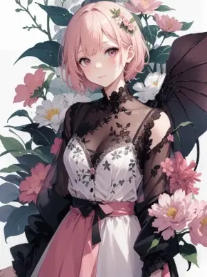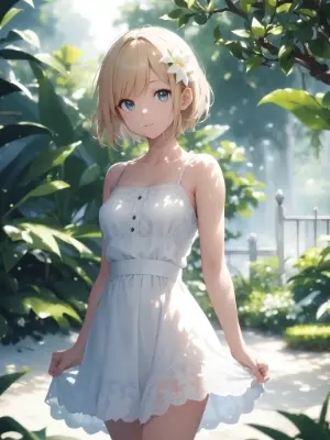 (blurry background:1.6), (extremely detailed fine touch:1.3), (hard light, studio light, light rays, dappled light, reflection, shadows, ray tracing:1.0), ///, girl, light blonde short hair, chignon, braided, (flower print white dress:1.3), flower garden, sea, beach, tree, blue sky, cloud, (brick:1.3), (reflection:1.3)