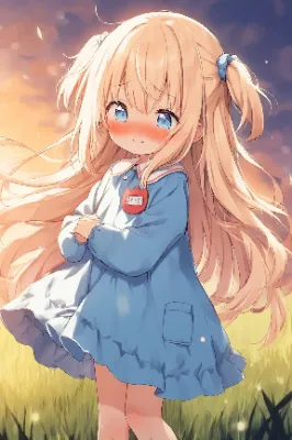 1girl, ((little female child)), loli, toddler, preschooler, two side up, blonde long hair, long white dress, long sleeves, pink ribbon, sash, embarrassed, [[surprised]], blue eyes, standing on grass, outdoors, (wind), red backpack, randoseru, hands between legs, masterpiece, best quality