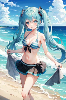 masterpiece, best quality, extremely detailed, anime, girl, skirt, Hatsune Miku, VOCALOID, long twin-tails in blue-green, girl with beautiful blue eyes, white sandy beach and blue sea and sky, cute smiling girl in striped bikini, soap bubbles