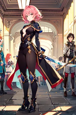 masterpiece, best quality, extremely detailed,masterpiece, best quality, {{{masterpiece}}}, {{{best quality}}}, {{ultra-detailed}},{{an extremely delicate and beautiful}}, brown hair ,black eyes, breasts,{short hair},{slanted eyes}, gleaming skin,realistic, photorealistic, arm at side, wavy hair, younger,standing, cowboy shot,fair skin, group picture, bodysuit ,rash, fantasy, braband, full body, sword girls,magic,knights,amor,boots, slit pupils, pink hair,