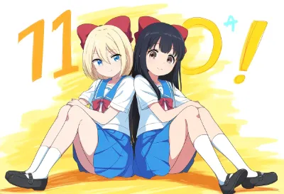 2girls,blonde hair,blue eyes,short hair,(hair bow:1.4),red bow,black hair,long hair,snow mountain peak,starry night sky,meteor shower,(sharing moment:1.2),triumphant expression,(mountain summit:1.3),winter clothing,matching winter coats,warm gloves,(night sky:1.2),snowflakes,soft wind,close friends,side by side,looking up,(detailed sky:1.1),sparkling eyes,slight smile,(winter atmosphere:1.2),mountain ridge,snowy landscape,distant stars,(emotional connection:1.1),soft lighting,depth of field,master piece,best quality,very aesthetic,absurdres,(high resolution:1.1),