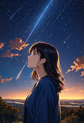 the starry night sky, meteors, the sky full of stars and some comets, masterpiece, best quality, expressive eyes, perfect face, 1 Girl, witch, winter, buddy black cat, outdoors, mysterious, for the audience, standing, smile, incredible colors, exquisite design, amazing surprise, dynamic production, high resolution, cinematic lighting, extremely detailed, 8k, meteor shower, fantasy, <lora:saturation:1>, <lora:make25d_type2_v100:1>