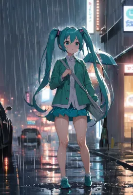 masterpiece, best quality, extremely detailed, anime, girl, skirt, Hatsune Miku, VOCALOID, blue-green long twintails, girl with umbrella in rainy city, blurred city lights in rain, car lights reflecting on road, rainy scene, night, busty, loli face