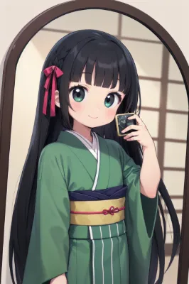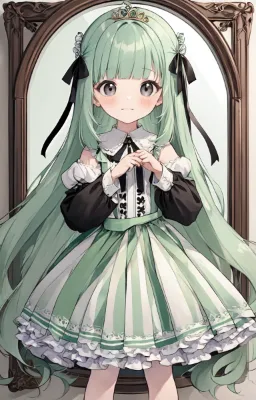 12 years old, Black Eyes, flat chest, long back hair, straight Hair, princess Cut, straight Across bangs, very longest hair, mintgreen stripe, hair ribbon, roundry Head, Droping eyes, cute, Meekness, Bob Cut, very long sideburn, flowing hair, girl,mirror