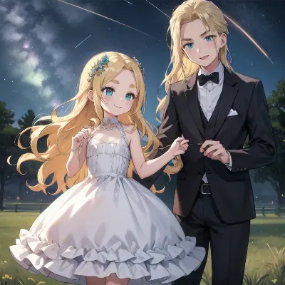 masterpiece,best quality,extremely detailed,1girl,child,infant body type,flat chest,blonde hair,wavy hair,long hair,aqua eyes,thick eyebrows,show_forehead,cute clothes,smile,night,meteor shower,(She has barbecue parties with many friends and their parents, using the finest meats),