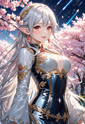 8K,((masterpiece,best quality,Ultra extremely detailed,perfect anatomy,detailed,high-resolution,highres,extremely detailed)),((close-up head from below,Flowers print,girl elf wearing glossy jewelry decoration red leather suit with sparkle reflected light, wearing white-sox, see-through sleeves,see-through white gloves, see-through white boots)),looking at viewer, red Eyes, Reflections reflect strong highlight in eyes,waving shining long white hair_with curly,elf ear with big earrings,opened_mouth:1.5,smile,blush,lipstick,full fresh lips,wet_lip,big hip,small breasts ,front mirror,BREAK,4K,(another yellow eyes child elf in mirror) BREAK,4K,(meteor shower),(Cherry blossoms),many Petals falling off,Very dark Night,lightning,((many shooting stars)),birds, <lora:hairdetailer:1> <lora:make25d_type1_v100:1>