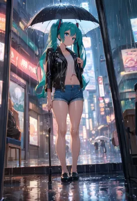 masterpiece, best quality, extremely detailed, anime, girl, Hatsune Miku, VOCALOID, blue-green long twintails, blue eyes, old abandoned castle returning to nature, scene illuminated by the morning sun, girl in denim shorts and leather jacket, nostalgic, cute smile
