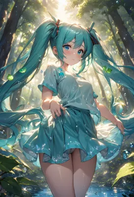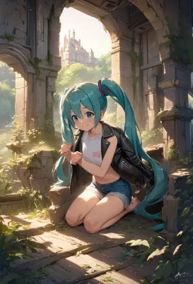 masterpiece, best quality, extremely detailed, anime, girl, Hatsune Miku, VOCALOID, blue-green long twintails, blue eyes, old abandoned castle returning to nature, scene illuminated by the morning sun, girl in denim shorts and leather jacket, nostalgic, cute smile