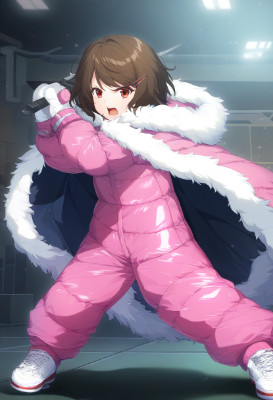 {{{{{down jacket, snowsuit, coveralls, long stitched padded puffy pants, big long fluffy fur-trimmed cape}}}}}, {{{heavy clothes, fur-trimmed sleeves, fur-trimmed cuffs, fur-trimmed hood, oversized clothes, shiny clothes}}}, [[[latex]]], cute girl, solo, sneakers, contrapposto, [[[[[[[[[[gochuumon wa usagi desu ka?]]]]]]]]]], {{{{{indoors, arcade, can, holding can, expressionless, dutch angle, hand in pocket, looking at another}}}}}, orange hair, {{{magenta eyes, brown jacket, brown pants}}}, long hair, high ponytail, large bow in hair, crossed bangs, , best quality, amazing quality, very aesthetic, absurdres