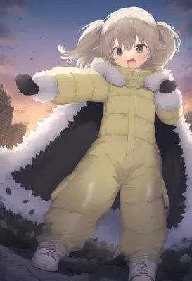 {{{{{down jacket, snowsuit, long stitched padded puffy pants, big long fluffy fur-trimmed cape}}}}}, {{{heavy clothes, fur-trimmed sleeves, fur-trimmed cuffs, fur-trimmed hood, oversized clothes, shiny clothes}}}, [[[latex]]], cute girl, solo, sneakers, contrapposto, [[[[[[[[[[gochuumon wa usagi desu ka?]]]]]]]]]], mittens, {{{{{outdoors, lying, sleeping, snowing, wind}}}}}, {{{gray hair}}}, white jacket, white pants, long hair, blunt bangs, french braid, severed hair, , best quality, amazing quality, very aesthetic, absurdres