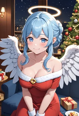 masterpiece, best quality, extremely detailed, anime, 1girl, solo, mika (blue archive), single side bun, halo, wings, pink hair, long hair, white wings, hair bun, wrist scrunchie, scrunchie, yellow eyes, Christmas costume, dress, off shoulder, Christmas party, night, living room