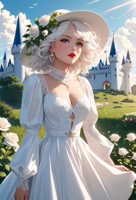 fall in love, wifemodel, French braid hair, flower Halter Dress, cleavage, white roses, garden landscape design, rim light, sunnysmaile, cinematic lighting, 8k resolution, amazing sapraizz, dynamism, best quality, decorate white roses with ornaments, <lora:saturation:1>, <lora:make25d_type4_v100:0.5>
