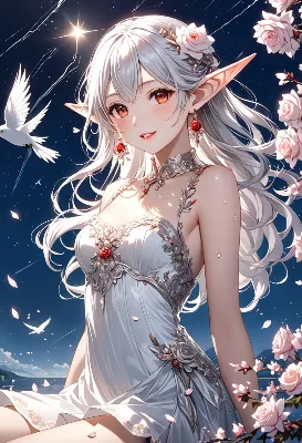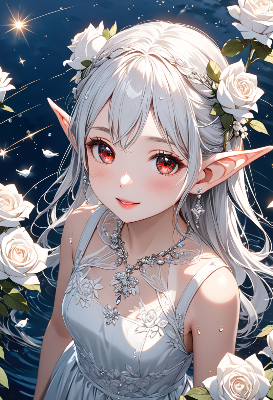 8K,((masterpiece,best quality,Ultra extremely detailed,perfect anatomy,detailed,high-resolution,highres,extremely detailed)),((close-up head, white rose Flowers print,girl elf wearing glossy jewelry decoration white cloth-dress with sparkle reflected light,short-skirt,see-through brown tights)),looking at viewer:1.5, red Eyes, Reflections reflect strong highlight in eyes,waving shining long white hair_with curly,elf ear with big earrings,opened_mouth:1.5,smile,blush,lipstick,full fresh lips,wet_lip,big hip,small breasts,armpit,BREAK,4K,big white roses,sky,Cherry blossoms,many Petals falling off,lightning,many shooting stars,birds,silent lake, ,, <lora:hairdetailer:1> <lora:make25d_type1_v100:1>
