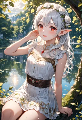 8K,((masterpiece,best quality,Ultra extremely detailed,perfect anatomy,detailed,high-resolution,highres,extremely detailed)),((close-up head, white rose Flowers print,child elf wearing glossy jewelry decoration white blouse with sparkle reflected light,santa-robe,head band,short-skirt,see-through brown tights)),looking at viewer:1.5, (red Eyes), Reflections reflect strong highlight in eyes,waving shining long white hair_with curly,elf ear with big earrings,opened_mouth:1.5,smile,blush,lipstick,full fresh lips,wet_lip,big hip,small breasts,armpit,sit,BREAK,4K,big white roses,((sunset glow)),many Petals,lightning,many shooting stars,birds,silent lake,city in the distance,dark cloud, <lora:hairdetailer:1> <lora:make25d_type1_v100:1>