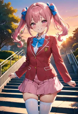 masterpiece, best quality, ultra-detailed, illustration, extremely detailed, perfect anatomy, super detailed skin, detailed, beautiful detailed eyes, anime, high school girl, black hair, braids, round glasses, blue eyes, sailor uniform, long sleeves, red sailor uniform, white shirt, classroom, desk, hands on own face, smiling, blushing, sunset