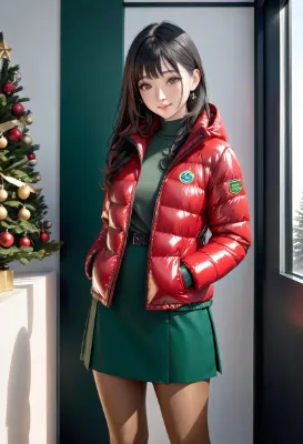 (photorealistic:1.4), (RAW photo), masterpiece, best quality, extremely detailed, lady, maid, neat and clean, elegant, polite, dark brown medium length hair, almond shaped eyes, staring, smile, (shiny, glossy, enamel, rubber, down jacket, sailor collar:1.2), pleated skirt, white brim, apron, living room