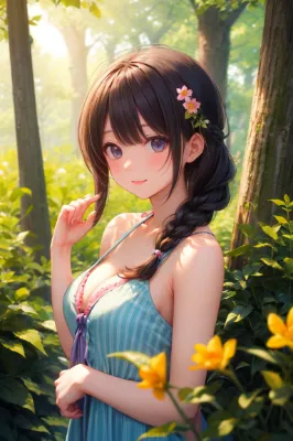 woodland sunlight, wifemodel, French braid hair, flower Halter Dress, cleavage, garden landscape design, sunnysmaile, cinematic lighting, amazing sapraizz, dynamic composition, masterpiece, 8k resolution, high quality, saturation:1, make25d_type4_v100:1