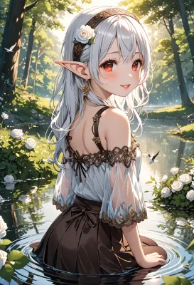 8K,((masterpiece,best quality,Ultra extremely detailed,perfect anatomy,detailed,high-resolution,highres,extremely detailed)),((upper-body ,white rose Flowers print,child elf wearing glossy jewelry decoration blouse with sparkle reflected light,head band,short-skirt,see-through tights)),looking at viewer:1.5, (red Eyes), Reflections reflect strong highlight in eyes,waving shining long white hair_with curly,elf ear with big earrings,opened_mouth:1.5,smile,blush,lipstick,full fresh lips,wet_lip,big hip,small breasts,armpit,sit,BREAK,4K,forest,many_leaves,((sunlight filtering through trees)),birds,silent lake,city in the distance,dark cloud, <lora:hairdetailer:1> <lora:make25d_type1_v100:1>,