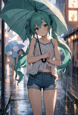 masterpiece, best quality, extremely detailed, anime, girl, Hatsune Miku, VOCALOID, blue-green long twintails, girl taking shelter from the rain in a ruin, blurred view outside the window due to rain, rainy scene, girl in cut-off jean shorts resembling short pants and a hoodie with cat ears, gentle smile, beautiful girl, cute loli face, rain sounds