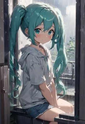 masterpiece, best quality, extremely detailed, anime, girl, Hatsune Miku, VOCALOID, blue-green long twintails, skirt, fairy girl taking shelter from the rain in a large tree hole, rainy forest, gentle smile, beautiful girl, loli, child, my child, sound of rain