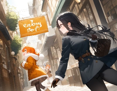anime-style, serene winter garden, tiny white cat girl, loli, 3-years-old, first snowfall, playing, gazing up, large black dog, awe, joy, short white hair, cute white cat ears, white cat tail, soft white pinafore dress, warm winter coat, massive black dog, lying down, soft fluffy fur, tender expression, protective, warm demeanor, frosty garden, snow-covered ground, bare trees, gentle morning light, tranquil atmosphere, heartwarming, detailed anime aesthetics, expressive eyes, fine shading, vibrant colors