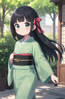 girl with very long black hair, straight hair, hair ribbon, mintgreen stripe, black eyes, flat chest, straight across bangs, princess cut, very long sideburn, roundry head, dropping eyes, cute, meekness, bob cut, long back hair, 12 years old, kimono, smile, snow scene, in the Room, Beyond The Window