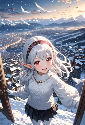8K,((masterpiece,best quality,Ultra extremely detailed,perfect anatomy,detailed,high-resolution,highres,extremely detailed)),(from_above ,white rose Flowers print,child elf wearing glossy jewelry decoration white sweater with sparkle reflected light,nit white gloves,nit head band,nit short-skirt,cute tights)),looking at viewer:1.5, (extra detailed red Eyes with reflection), waving shining long white hair_with curly,elf ear with big earrings,open-mouth-wide,smile,blush,lipstick,full fresh lips,wet_lip,big hip,small breasts,on the path,BREAK,4K,path in the snow,snow,many_falling snow,birds,on mountain top,city in the distance,dark cloud, , <lora:hairdetailer:1> <lora:make25d_type1_v100:1>,,