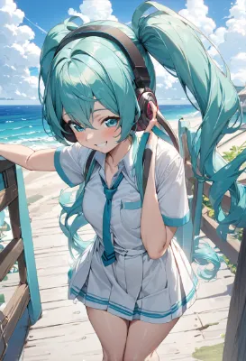 masterpiece, best quality, extremely detailed, anime, girl, Hatsune Miku, VOCALOID, blue-green long twintails, girl, blue eyes, beautiful, cute, smiling, sanctuary in the forest, forest path, waterfall, stream, dripping water droplets from the body, sparkling water splashes, sparkling water beads, fantasy, fairy