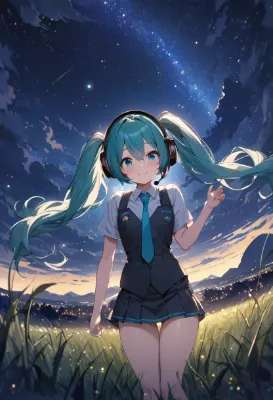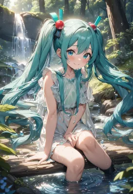 masterpiece, best quality, extremely detailed, anime, girl, Hatsune Miku, VOCALOID, blue-green long twin tails, girl, skirt, girl holding a red umbrella on a rainy path, beautiful girl, cute, smiling, rainy scenery, landscape blurred by rain