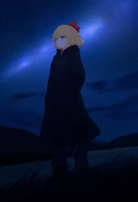 1girl,solo,blonde hair,blue eyes,short hair,night scene,sakura tree,night sky,sword,holding sword,pointing upward,(moonlight:1.3),(hair bow1.4),red bow,black uniform,military-style jacket,standing,(dramatic pose:1.4),(night atmosphere:1.2),detailed hair,detailed eyes,wind blowing,loose hair,(falling cherry blossom petals:1.3),dark background,silhouette,(anime style:1.4),sharp edges,glowing sword,(mystical environment:1.2),pale skin,determined expression,slight smile,winter night,bare branches,(aesthetic composition:1.3),magical girl,weapon,(dynamic lighting:1.2),masterpiece,best quality,very aesthetic,(absurdres:1.1),