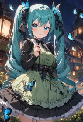 masterpiece, best quality, extremely detailed, anime, girl, Hatsune Miku, VOCALOID, blue-green long twintails, girl, blue eyes, skirt, fantastical night scenery, green frilly dress beauty, gothic lolita fashion, night sky, starry sky, full moon, cute, smiling, busty beauty, loli face, fantasy