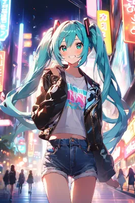 masterpiece, best quality, extremely detailed, anime, girl, Hatsune Miku, VOCALOID, blue-green long twintails, girl, blue eyes, denim shorts with leather jacket, beauty in ruins at night, mischievous smile, cute, night sky, starry sky, busty beauty, loli face