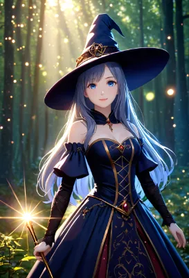 Silent forest, ray of light, magical pretty null blue stream overlay scene, soft lighting, clean background, beautiful null scenery, high quality, beautiful graphics, high detail, sharp focus, witch, perfect human body modeling, 8k, 1 wife woman, pretty face, bitter smile, beautiful gray long hair, beautiful blue eyes, flat chest, small build, no muscles, white skin, big magic wand, gothic skirt, magical girl, little Medieval Dress, Princess Dresses, big black hat, light particles, light sparkles, lens flare, magic light, strong light, amazing sapraizz, extremely detailed, dynamic production, cinematic lighting, rays of light, high resolution, so quiet, 静寂 <lora:saturation:1> <lora:make25d_type4_v100:1>