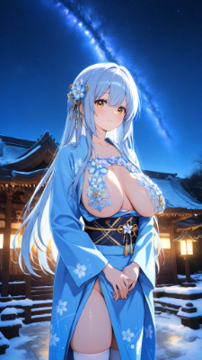 masterpiece, best quality, very aesthetic, highres, ultra-detailed, (((Starry sky))), An anime-style illustration of a serene winter night, featuring a girl with light blue twin-tail hair, wearing an elegant blue kimono adorned with floral patterns. She holds a traditional Japanese parasol with a cherry blossom motif, creating a gentle and refined atmosphere. The setting is in front of a snow-covered traditional Japanese temple gate, with snow gently falling around. The ground is blanketed in snow, reflecting the soft glow of the moonlight. The girl gazes forward with a calm and curious expression, her golden eyes adding warmth to the cold, serene scene. The composition emphasizes the harmony of traditional Japanese aesthetics and the tranquility of a snowy evening, HUGE BREASTS, SAGGING BREASTS,large breasts, beautiful breasts,white thighhighs,hand,light,photo background,The girl I like the most