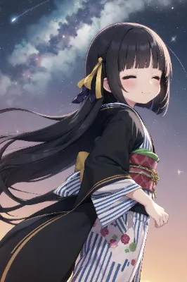 girl, solo, very long hair, black hair, straight hair, hair ribbon, mintgreen stripe, black eyes, flat chest, straight across bangs, princess cut, very long sideburn, roundry head, dropping eyes, cute, meekness, bob cut, long back hair, 12 years old, kimono, smile,shadow,Sunset,Road