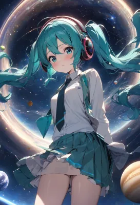 masterpiece, best quality, extremely detailed, anime, girl, Hatsune Miku, VOCALOID, blue-green long twintails, skirt, starry sky, night city, clock tower, snow falling, fluffy skirt and fluffy clothes beautiful girl, night, starry sky, snowflake